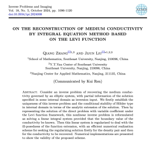 近日,Inverse Problems and Imaging(IPI)发布了2024–2025年高被引论文精选榜单。我院青年教师张嫱(博士)与东南大学黄色动漫 刘继军教授合作完成的研究论文:On the reconstruction of medium conductivity by integral equation method based on the Levi function 成功入选该榜单,标志着该成果在反问题与成像领域获得了广泛关注与认可。